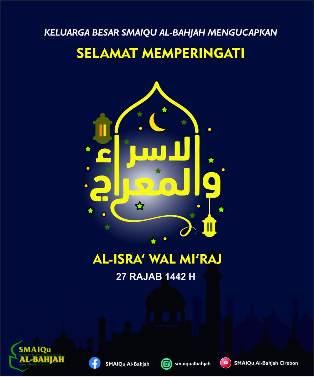 Keluarga besar SMAIQu Al-Bahjah mengucapkan Selamat Memperingati Isra' Mi'raj Nabi Muhammad SAW 1442 H. Semoga kita selalu dalam ketaqwaan dan kesehatan, serta kita semua selalu dalam keberkahan. Semoga Allah menambahkan kecintaan kita kepada Rasulallah shallallahu 'alaihi wa salam dan menjauhkan kita dari wabah dan segala bencana Aamiin