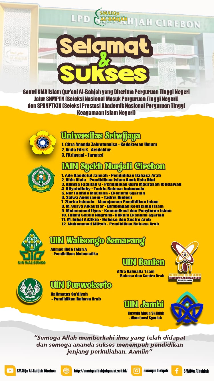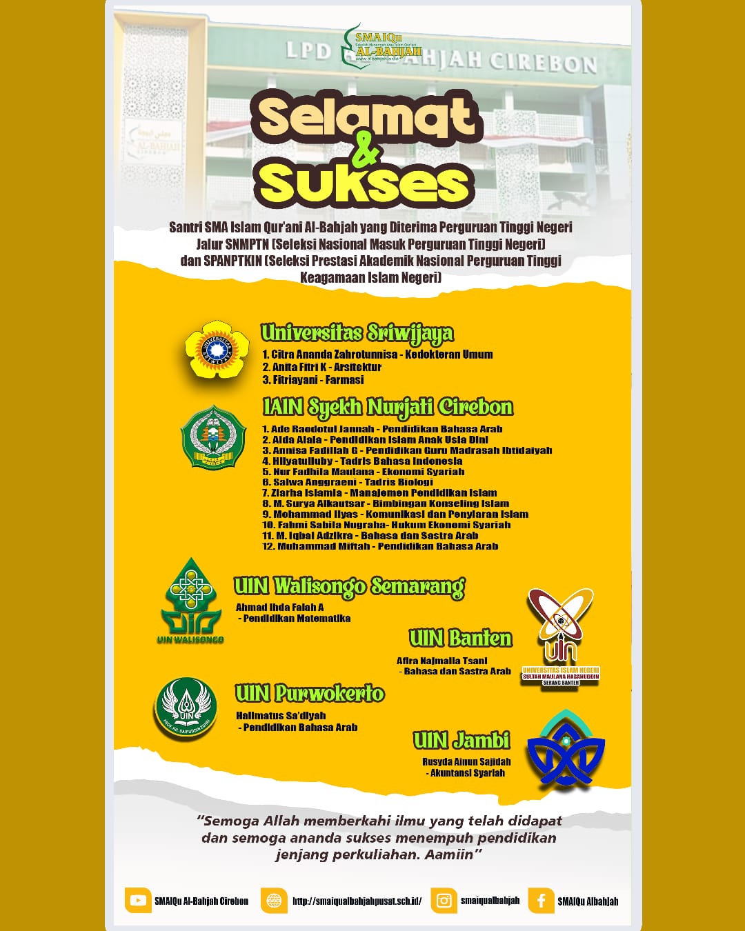 Segenap keluarga besar Divisi Pendidikan Formal Al-Bahjah dan SMAIQu Al Bahjah Pusat mengucapkan selamat atas diterimanya lulusan Santri SMAIQu Al Bahjah Pusat Cirebon Angkatan ke-4 di Perguruan Tinggi Negeri, Jalur _SNMPTN (Seleksi Nasional Masuk Perguruan Tinggi Negeri)_ & _SPANPTKIN (Seleksi Prestasi Akademik Nasional Perguruan Tinggi Keagamaan Islam Negeri)_
